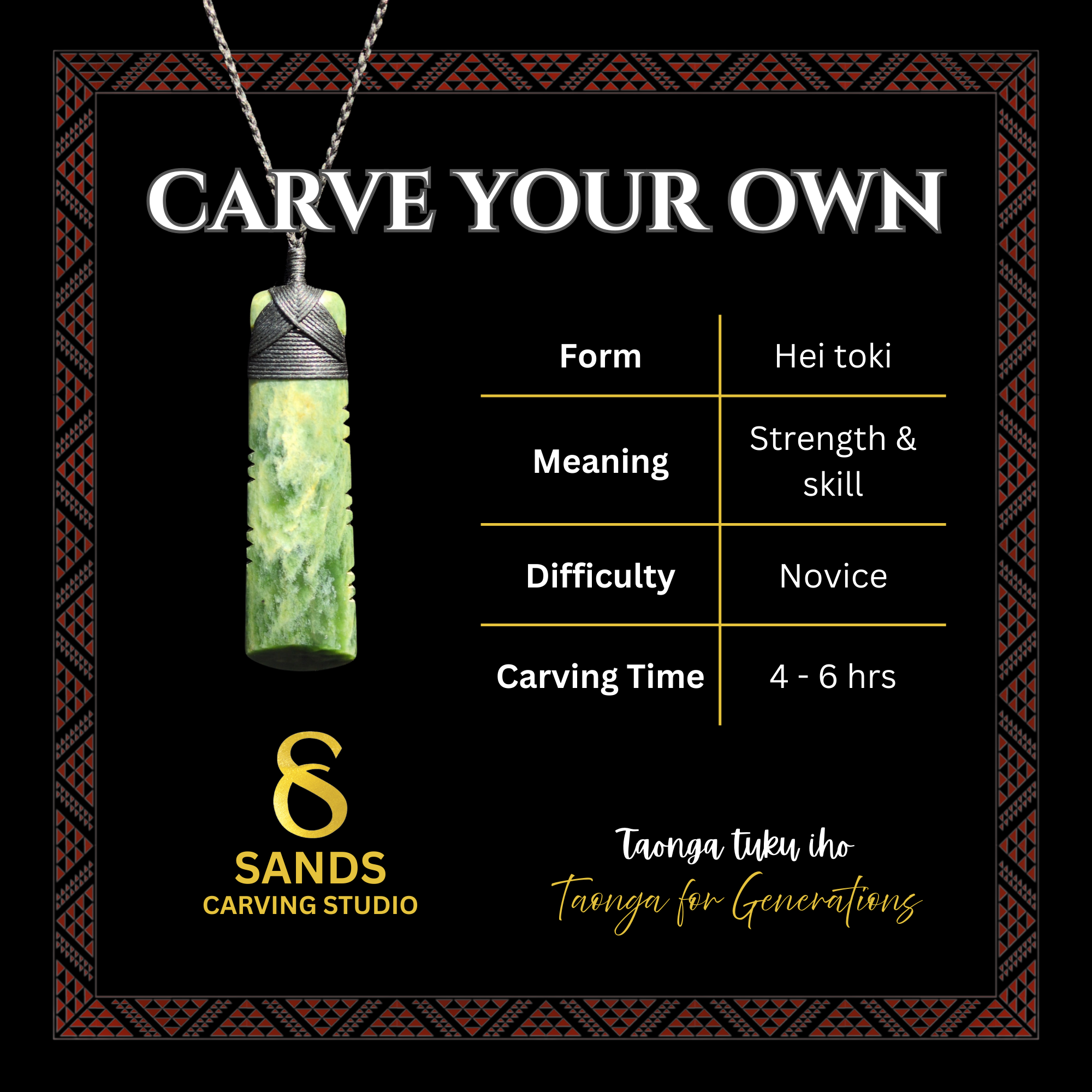 This workshop is designed for entry-level carvers with next to no carving experience, and will take up to 6-7 hrs. In this workshop we will cover the cultural history of the form, the tools and skills necessary for stone-carving and will guide participants through the process of creating a pounamu hei toki. By the end of the workshop, participants will have a fully completed and bound hei toki to take home.